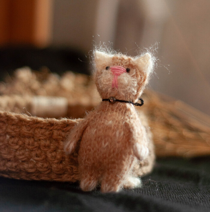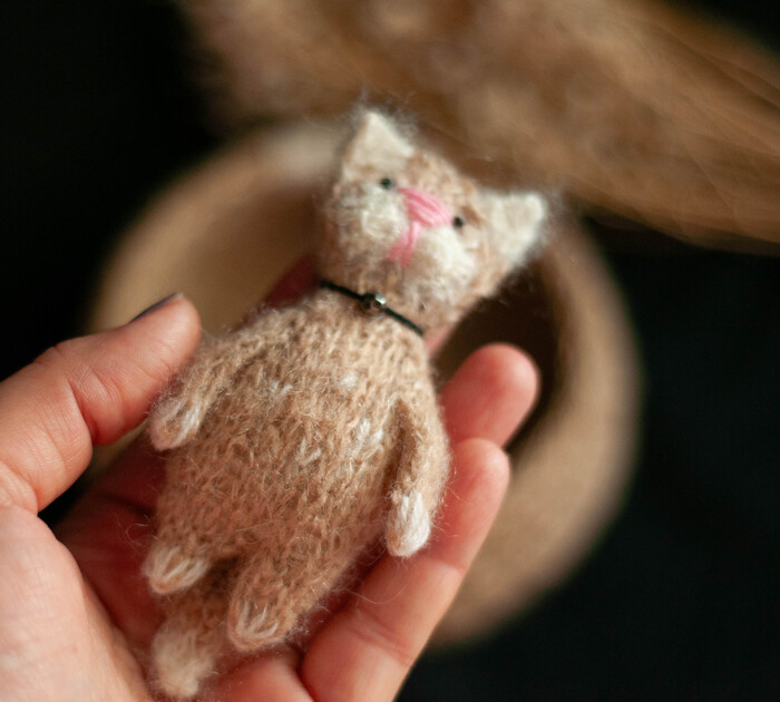 Котик из нежного мохера, с нарядным чокером на шее. Очень приятный тактильно и абсолютно маленький. До 9см ростом. Можно сделать брелок или обвес на сумку. А можно оставить и так, как карманного компаньона)