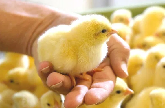 Цыплята только вылупились, им только насыпали жёлтого пшена, сверху греет теплая лампа.