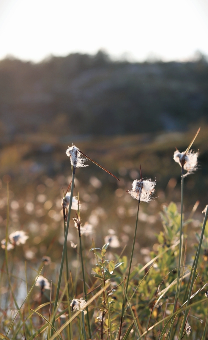 Сейчас на болоте словно кто-то разбросал кусочки ваты. Такой необычный вид имеют плоды растения под названием пушица влагалищная (Eriophorum vaginatum). При созревании плодов её околоцветник представляет собой гладкие мягкие белые волоски, внешне напоминающие пух. Поэтому у растения такое родовое растения - «пушица». В народе пушицу часто называют «хлопковая трава», «болотный хлопок» или просто «заячий хвостик».