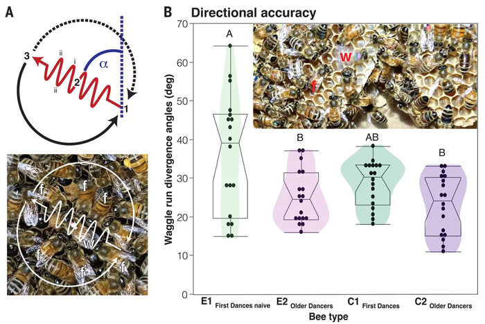 Слева изображена классическая схема танца пчелы, а справа — вариации зигзагообразной «проходки» у разных особей. E1 — это впервые танцующие пчёлы, которых некому было обучать. E2 — они же, но набравшиеся опыта. C1 — это впервые танцующие пчёлы, которые набрались опыта у более старших товарищей из категории C2.