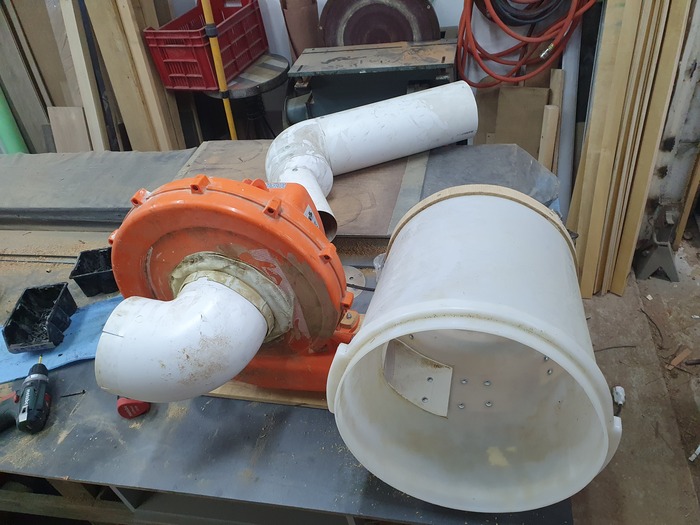 Но мощность его была невысока и на большую трассу не хватит. Поэтому был использован более мощный батутный нагнетатель и сделан еще один стружкосос помощнее. На это дело пошла бадья и некоторые фитинги для создания сепаратора. Мешок сшит по заказу - мне хотелось максимальной плотности фильтра.