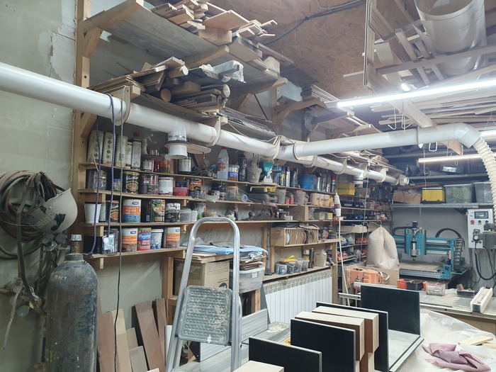 Пыли, стружки и опилок много при работе и это куда-то нужно девать. Для удаления все этого от станков я проложил к ним трассу и поставил один стружкосос на всю мастерскую