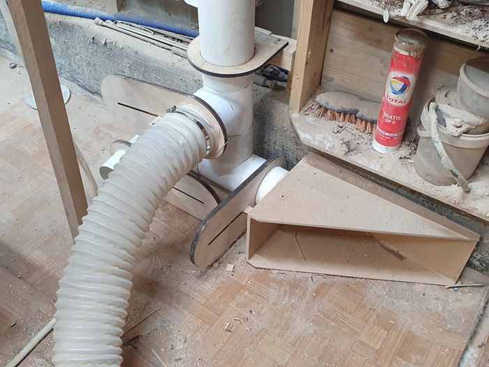 Есть сомнения в том, что мой стружкосос справится с потоком. Решается заменой на более мощный. Эффективность явно ниже отдельного малыша с отдельным хоботом. Пока привыкаю и смотрю на узкие места.
