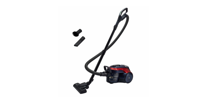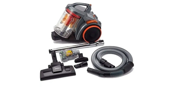 На девятой строчке стоит пылесос Midea VCS43A15, выполненный в привлекательном дизайне серебристого цвета с яркими оранжевыми вставками. Большие прорезиненные колеса обеспечивают маневренность и защиту поверхностей от повреждений. Отдельно стоит выделить большой контейнер для пыли – на целых 3 л, что позволяет проводить длительные уборки без опорожнения. Фильтр НЕРА удерживает частички пыли и при необходимости легко достается для очистки.