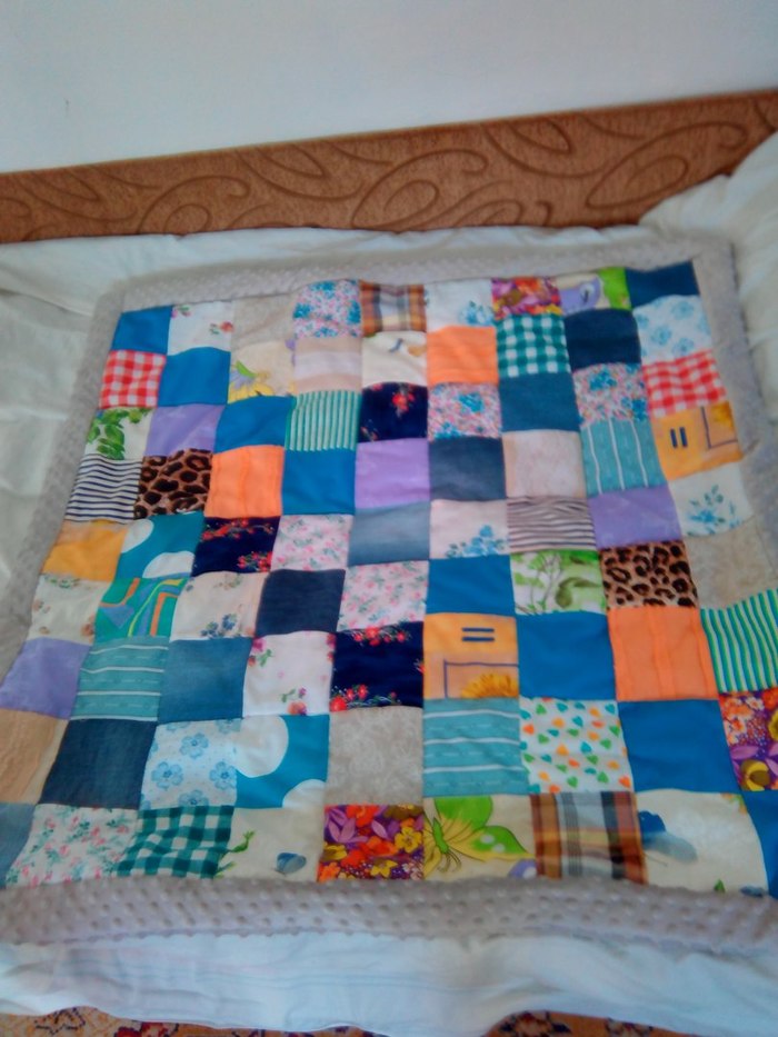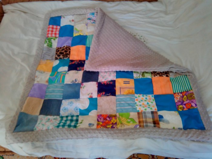 Плюш заказывала еще в прошлом году, лоскуты из джинсов, собранных по друзьям и из старых заначек, некоторые еще принадлежали бабушке (давно лелеяла мечту сделать лоскутное одеялко)