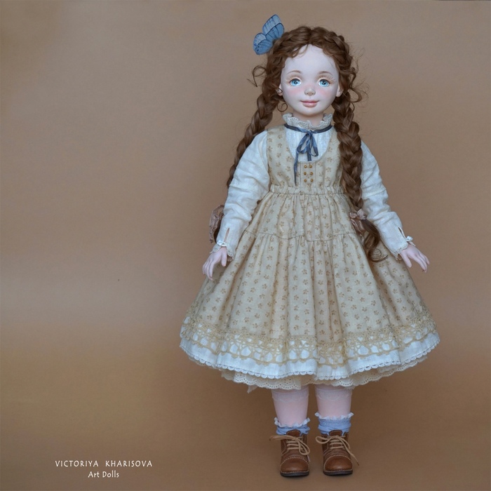 Моя авторская ручная работа, Варвара Краса) текстильная шарнирная кукла. С этой куклой наэкспериментировалась. Голову, шею и ноги покрыла грунтом, матовыми акриловыми красками и лаком - клир с уф защитой. Рост 45 см. Кукла плотно набита синтепоном, на вес тяжелая. Шарниры деревянные бусины. В кистях рук и шее есть проволочный каркас, пальчики сгибаются. Голова поворачивается и немного наклоняется. Волосы сделаны из козьего пуха, они покрашены и напитаны бальзамом, поэтому имеют приятный аромат.