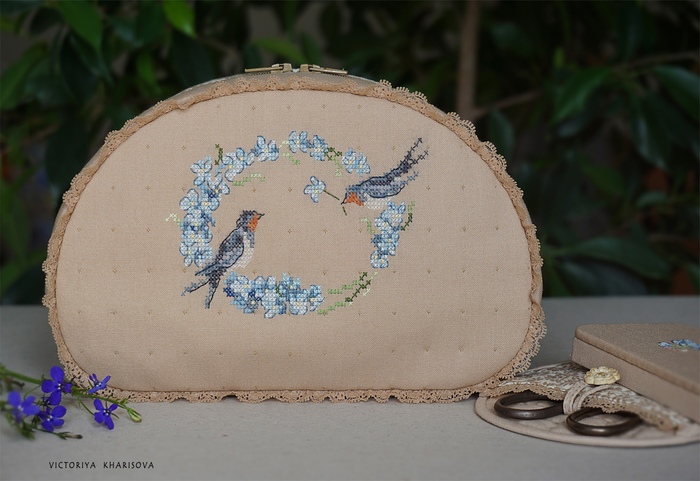 Еще сшила шкатулку для рукоделия. Получилась аристократическая простота в Английском стиле. Ручная стежка, спанбонд держит форму. К шкатулке сшила игольницу и чехол для ножниц. Уютные вышли вещицы. Вышивка на американском хлопке, ласточки и незабудки - воспоминания из детства, как они росли в поле у тропинки к бабушкиной даче, а перед дождем низко летали ласточки. Теплые воспоминания.