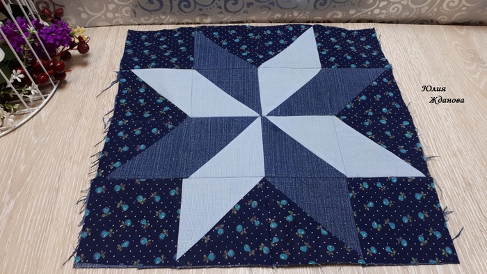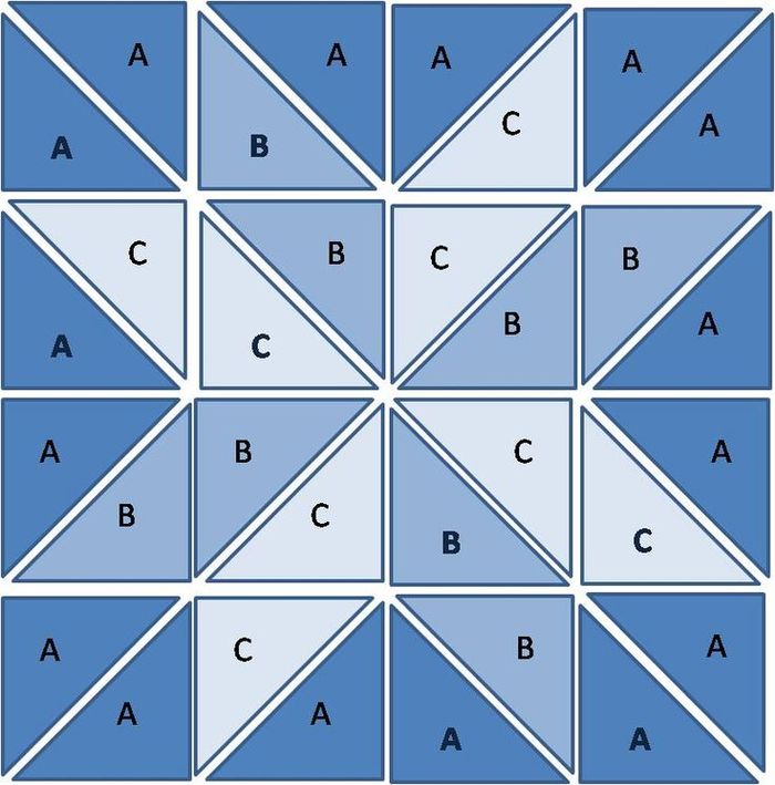 А - темно синий лоскут, В - джинсовый лоскут, С - голубой, в мелкую клеточку лоскут.