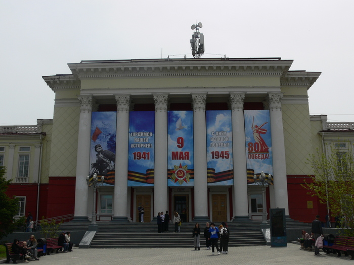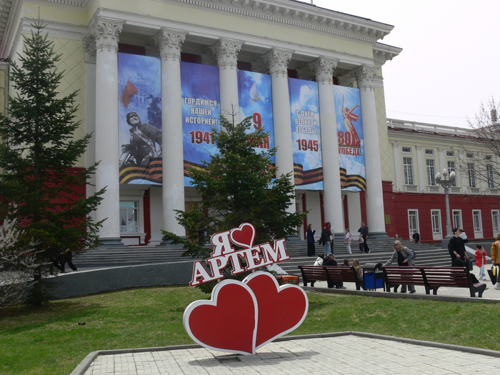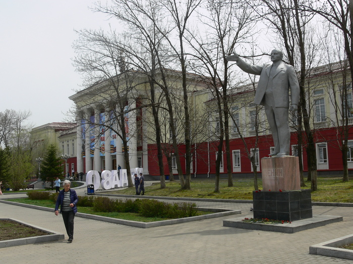 А напротив площади - Дворец культуры угольщиков, ДКУ - весьма красивое здание в стиле сталинской архитектуры. Рядом - памятник Ленину. В Артёме с декоммунизацией вообще всё как-то плохо, в городе стоят ещё как минимум два Ильича, а масса улиц имеют советские названия.