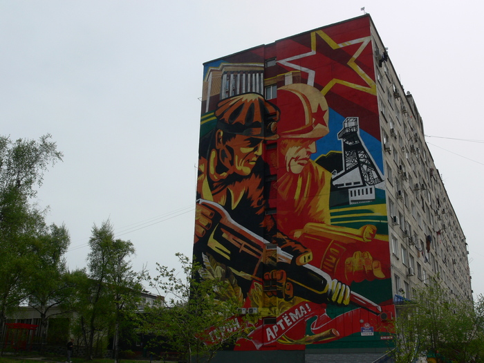 Отправляемся дальше в сторону центра города мимо ТЦ "Авиатор", физкультурно-оздоровительного комплекса и так далее по улице Фрунзе, одной из двух главных улиц Артёма, и уже через несколько минут попадаем на Фрунзенскую аллею. Останавливаться здесь надолго особого смысла нет, это просто зелёная зона вдоль улицы с лавочками, детской и спортивной площадкой и всем таким прочим. А в конце аллеи на торце гостинки (знаете, что это такое?) совсем недавно, к 9 мая нанесли новый красивый мурал, прославляющий подвиг шахтёров, ведь город был изначально шахтёрским и бойцов Артёма.