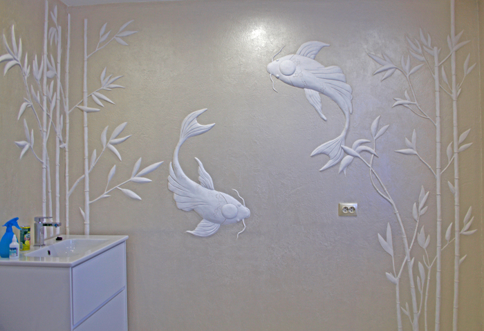 Основная фишка и сложность этой работы в том, что барельеф лепился уже на финишное покрытие стены.(Заказчик после ремонта захотел барельеф).