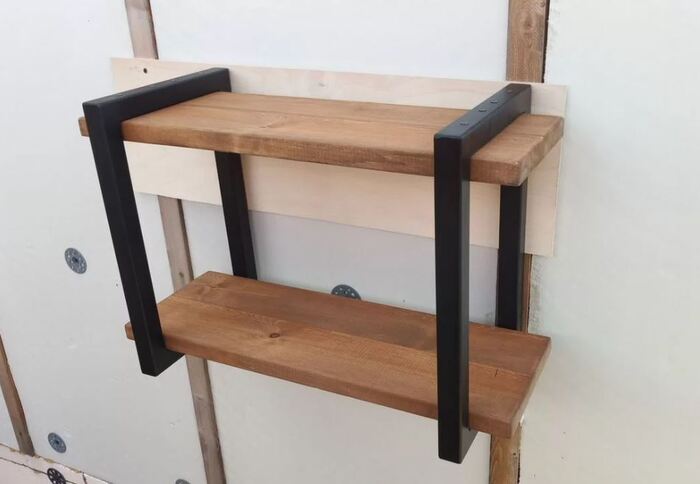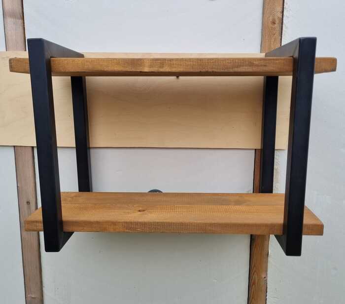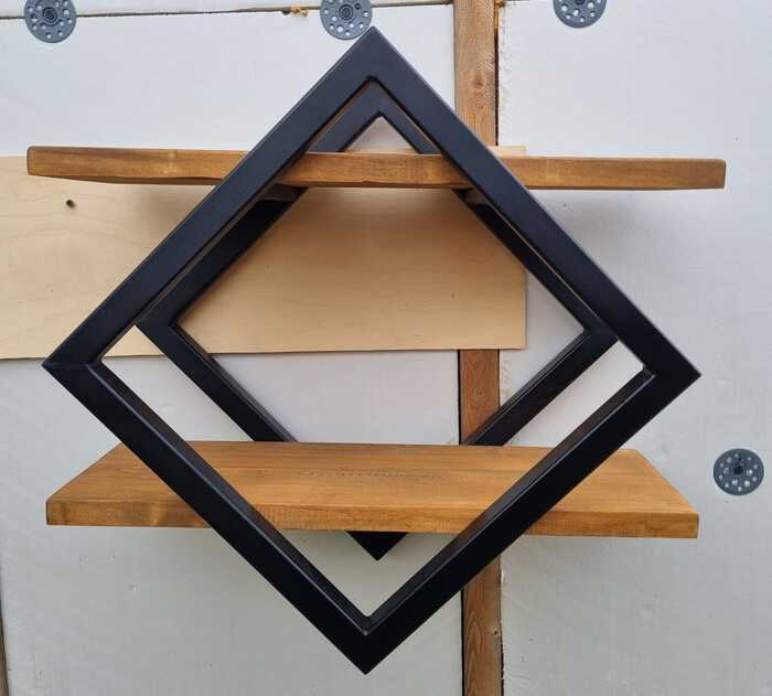 Про полки я не буду делать отдельный пост. Принцип как и везде, профтруба, варим квадратики, прямоугольники, соединяем все в кучу, красим порошком, а деревяшки маслом. Тем более что делал я их вместе с часами. Ширина поверхностей полок 200 мм, длина 600.