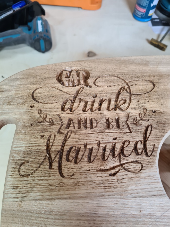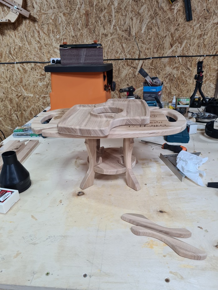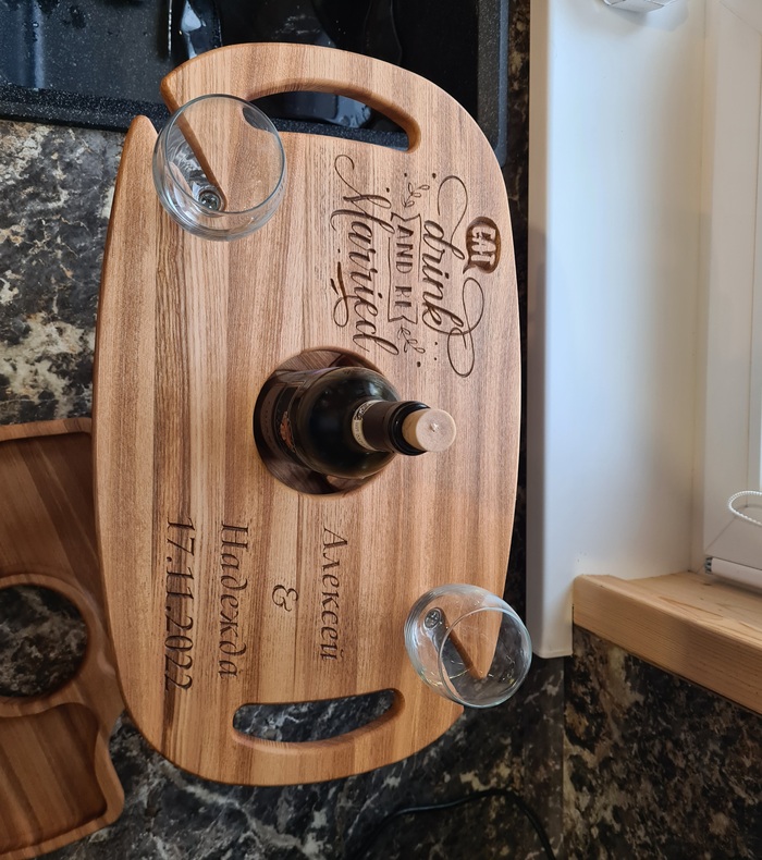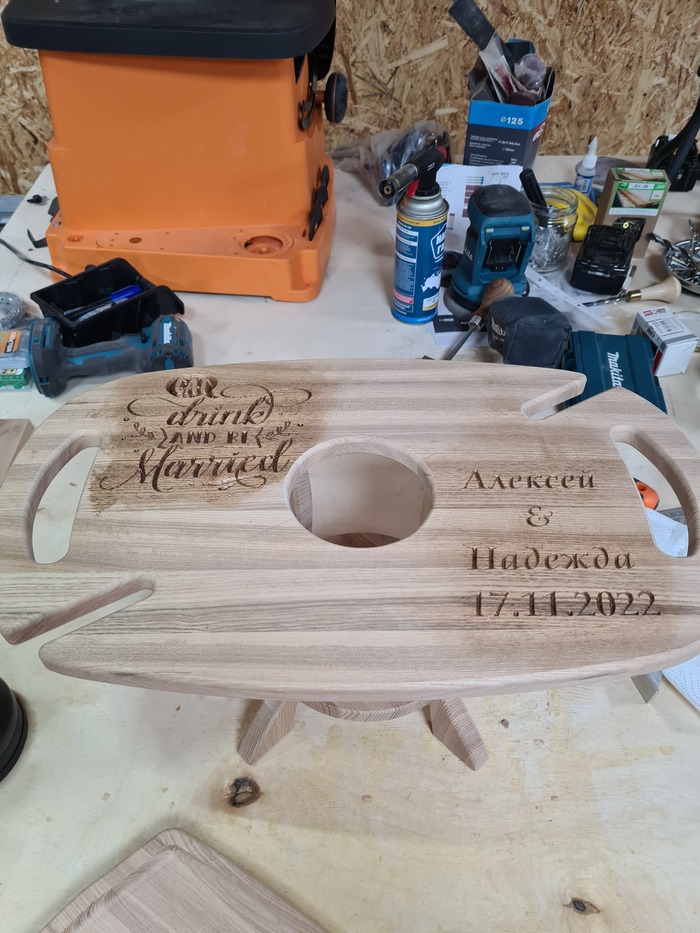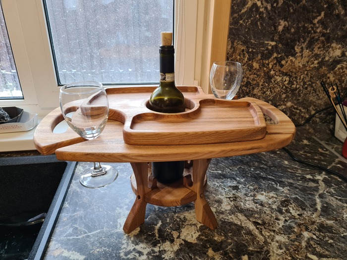 Сделал подарок друзьям на свадьбу. Столик под вино и закуски со съёмной менажницой. Всё в последний момент, как всегда, когда дарил на нём ещё масло не до конца высохло.