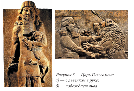 В частности, в «Списке шумерских царей» сказано, что царь Гильгамеш появился с планеты под названием Нибиру. Сопоставляя рост Гильгамеша и львенка, которого он держит одной рукой (рисунок 3а), можно предположить, что фигура человека на изображении существенно превышает рост пред ставителей современного населения нашей планеты. Возраст львенка, судя по внешнему виду, больше шести месяцев, но меньше года. Длина его тела в этот период приблизительно в два раза меньше взрослого льва (1,7–2,5 м). Следовательно, между грудью и окончанием таза Гильгамеша должно быть расстояние порядка 1 м. У современного мужчины ростом 175–180 см этот промежуток равен 40–45 см. Таким образом, Гильгамеш должен быть не менее чем трехметровым великаном. Рисунок 3б иллю стрирует не только габариты льва и человека, но и недюжинную силу, необходимую для того, чтобы мечом проткнуть насквозь это животное.