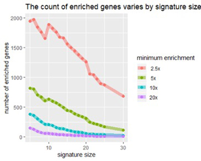 Рисунок 2: По мере увеличения размера подписи мы видим уменьшение количества генов, обогащенных любым фактором (например, в 5 раз выше нормы).
