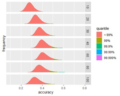На рисунке ниже показано влияние размера подписи на пиковую точность. Почти для любого размера сигнатура, построенная из случайно выбранных биомаркеров, будет иметь низкую точность, но, протестировав достаточное количество таких сигнатур, а затем посмотрев на точность верхней фракции (скажем, верхней 0,01%), мы увидим эффект, производимый размер подписи. Тщательно разработанные подписи должны достигать той же точности, используя меньше биомаркеров.