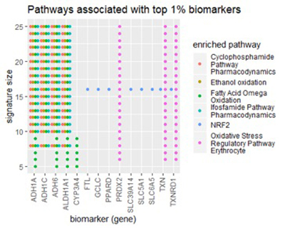 Все пять обогащенных путей связаны с обменом веществ, что означает распад химических веществ в организме. Любопытно, что первые два пути связаны конкретно с метаболизмом химиотерапевтических препаратов, циклофосфамида и ифосфамида. Последние три относятся либо к окислению, либо к предотвращению окислительного стресса (свободных радикалов) в эритроцитах.