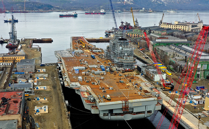 Тяжелый авианесущий крейсер "Адмирал Кузнецов" в доке 35-го судоремонтного завода.