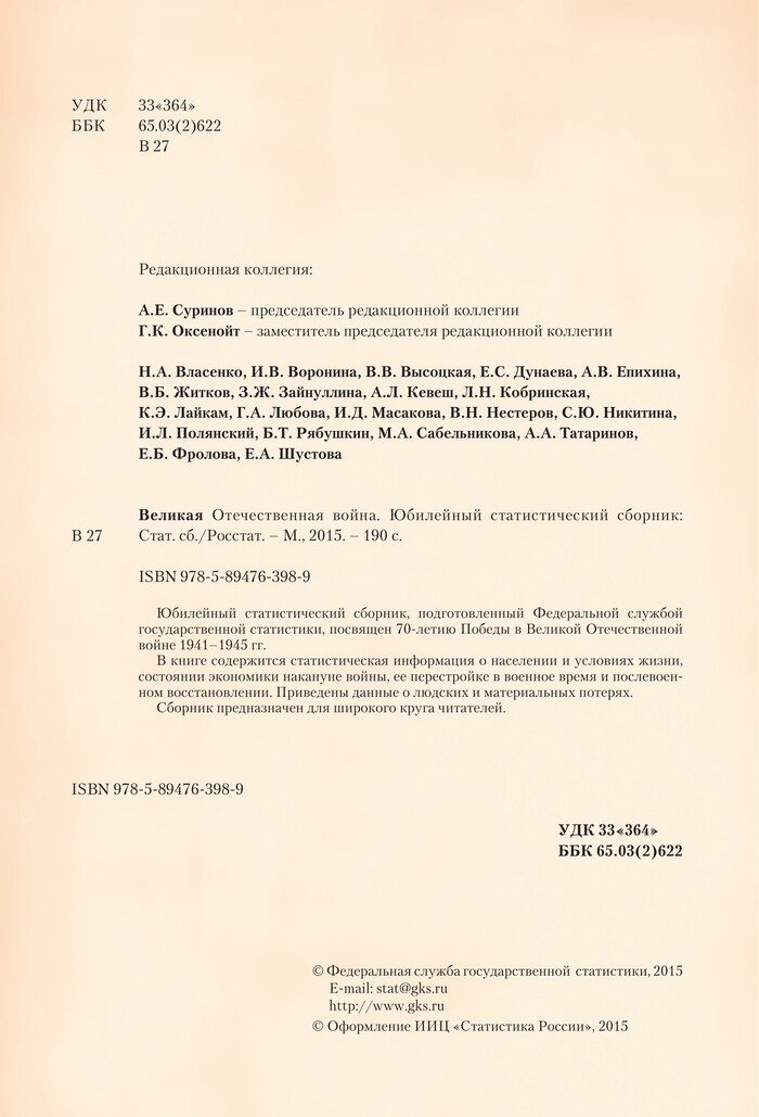Великая Отечественная война. Юбилейный статистический сборник: Стат. сб./Росстат. – М., 2015. – 190 с.