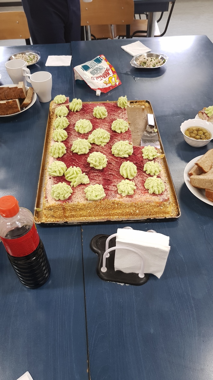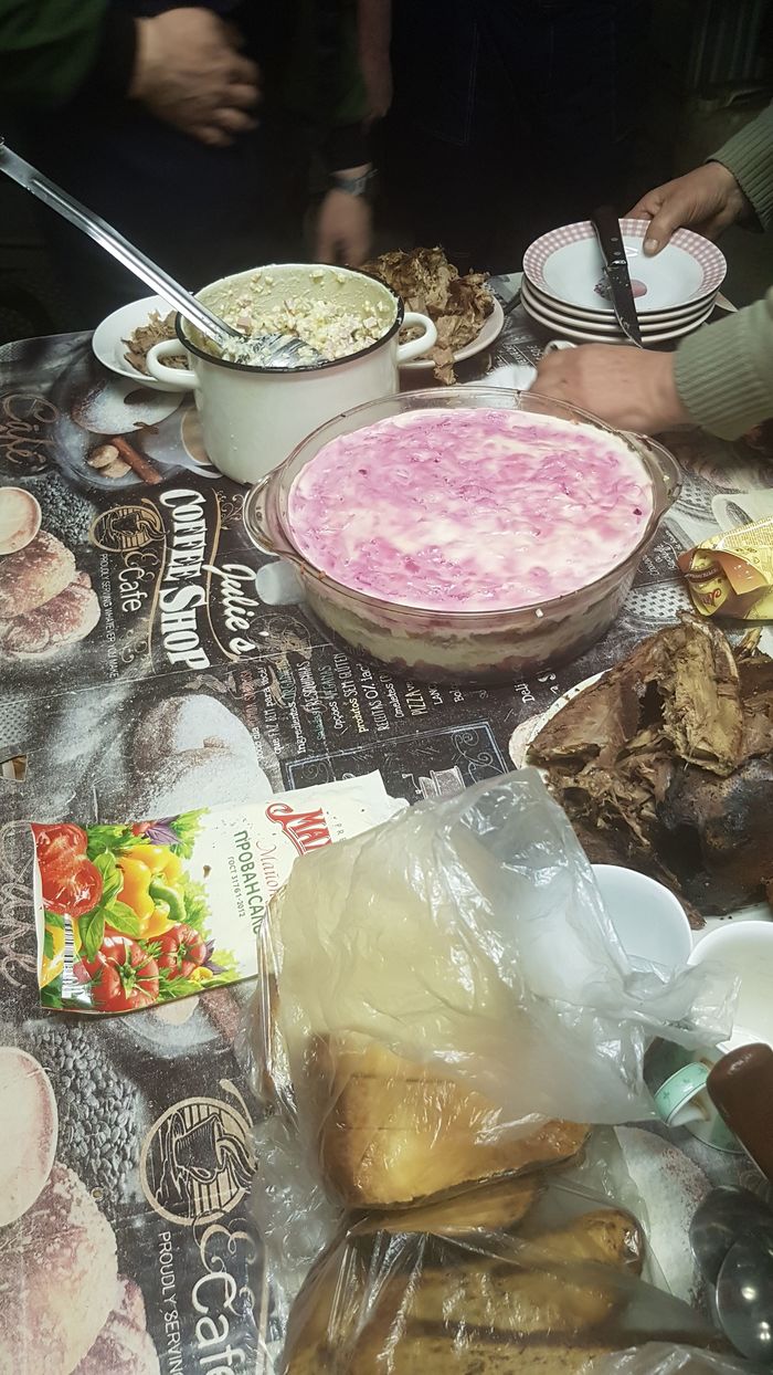 Стол был без алкоголя. На промысле пить нельзя. Тоже от слова "совсем". Из еды была картошка запеченная, винегрет, оливье, шуба, холодец, тхе и красной рыбы и что-то из макарон. Даже не могу объяснить что это было. На фото - справа на первом плане.