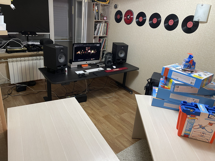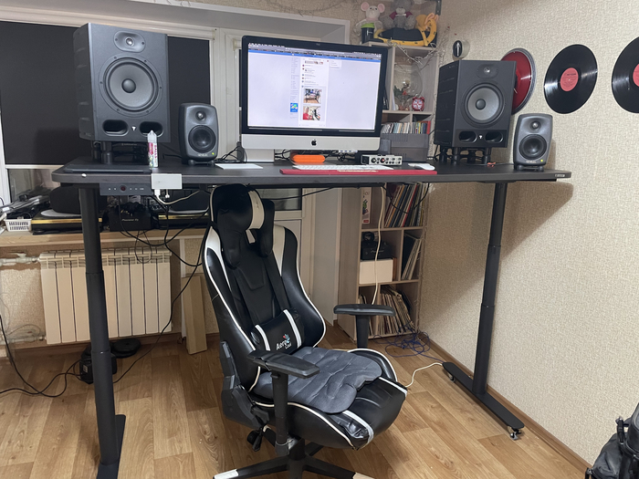 Ниже будут фото с разных времён, поэтому не удивляйтесь, что периодически интерьер немного меняется. Всё начиналось с двух офисных столов, а позже я купил стол, который меняет своё расположение по вертикали и за ним удобно работать стоя, а также благодаря колёсикам, я меняю иногда его положение в принципе в комнате.
