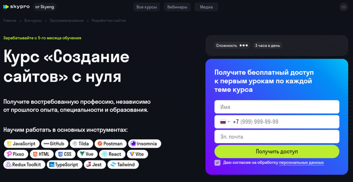 Бесплатный курс по созданию сайтов с нуля от одной из самых популярных онлайн-школ. Подойдет новичкам, которые хотят быстро изучить основы новой профессии, спроектировать собственный лендинг.