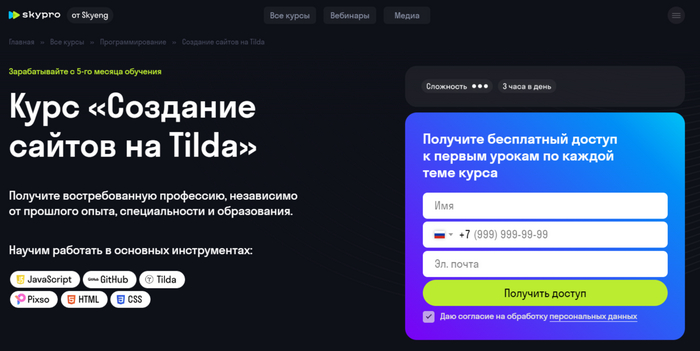 Создание сайтов на Tilda от Skypro – курс с комфортным обучением в малых группах и помощью с трудоустройством.