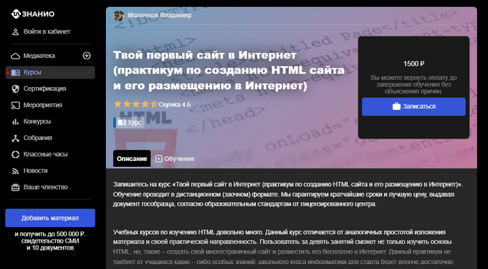 Курс Твой первый сайт (практикум по созданию HTML сайта и его размещению) от Знанио — лучший недорогой курс.