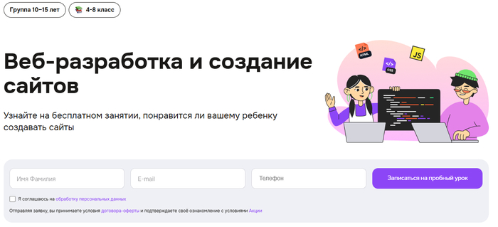 Веб-разработка и создание сайтов для детей от GeekSchool. Курс для детей и подростков 10–15 лет, которые хотят попробовать себя в веб-дизайне. Юные студенты изучают JavaScript, CSS и HTML, собирают портфолио из шести собственных проектов, могут освоить сразу 3 профессии, пройдут полное обучение по разработке сайтов, научатся командной работе, как в настоящей IT-компании. Занятия проходят 1–2 раза в неделю в небольших группах. Продолжительность обучения — 8 месяцев. Можно оплатить курс материнским капиталом, есть налоговый вычет.