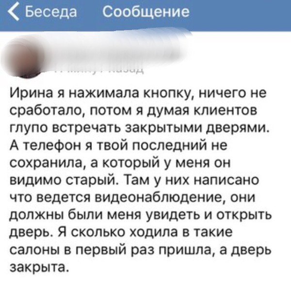 После чего, на вопрос : "Почему вы не открыли моей клиентке дверь?", был получен ответ, что они в тот день временно не работали.