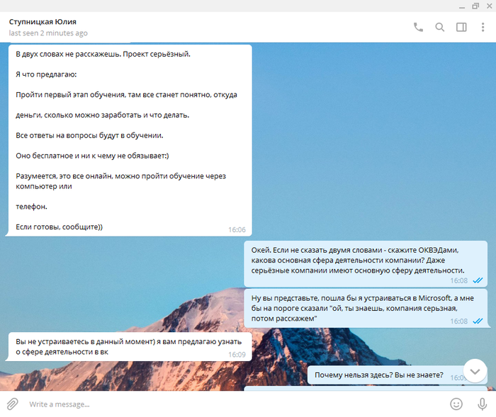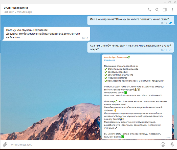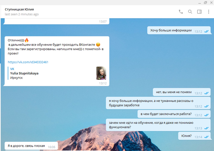 В итоге Юлия перестала отвечать на мои сообщения. Видимо, не судьба мне «открыть свой бизнес», «стать их партнером» и иметь «стабильный растущий доход».