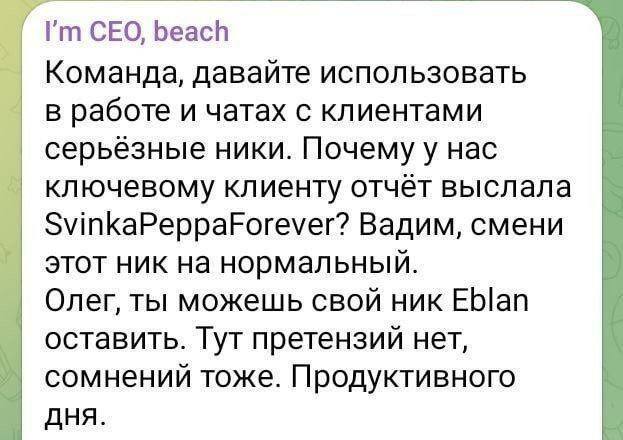 Да, вы задолбали со своими никнеймами, ладно школьный чат, но когда в рабочем чате, в крупной организации, появляется человек с ником "ganjubas324" вместо имени и фамилии, и все коллеги пытаются понять, кто это вообще, или еще хуже такой олень стучится к тебе в личку, пишет просто "Привет", и начинает что-то спрашивать по работе. Ты кто вообще? Как тебя зовут? Олень, укажи своё имя! Заведи аккаунт для официальных контактов и веди официальную переписку в отдельном аккаунте, если тебе так важен твой дебильный никнейм и твоя "приватность".