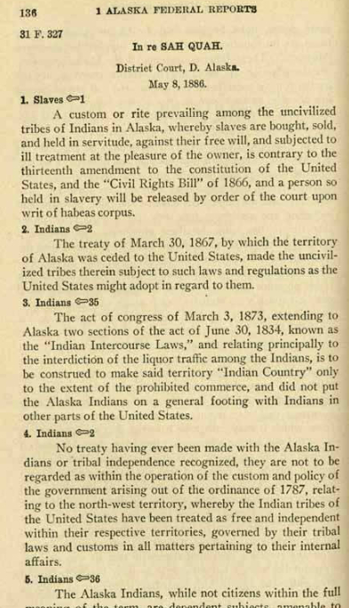 В 1886 году индеец по имени Са Куа, ободранный, тощий, прошедший членовредительство, добрался до Ситки (бывшего Ново-Архангельска) и подал в суд на хозяина, который отказывался его отпускать. Уже была цивилизация, так что колоши не отрезали судье голову, а цивилизованно судились, требуя освободить их от запрета на рабство и работорговлю. Во-первых, требуем уважать наши культурные обычаи, работорговля - красивая старинная традиция, духовная скрепа и основа хозяйства. Во-вторых, мы в 1865 году в США не были, штатом не являемся, так что вашей конституцией желаем подтереться.