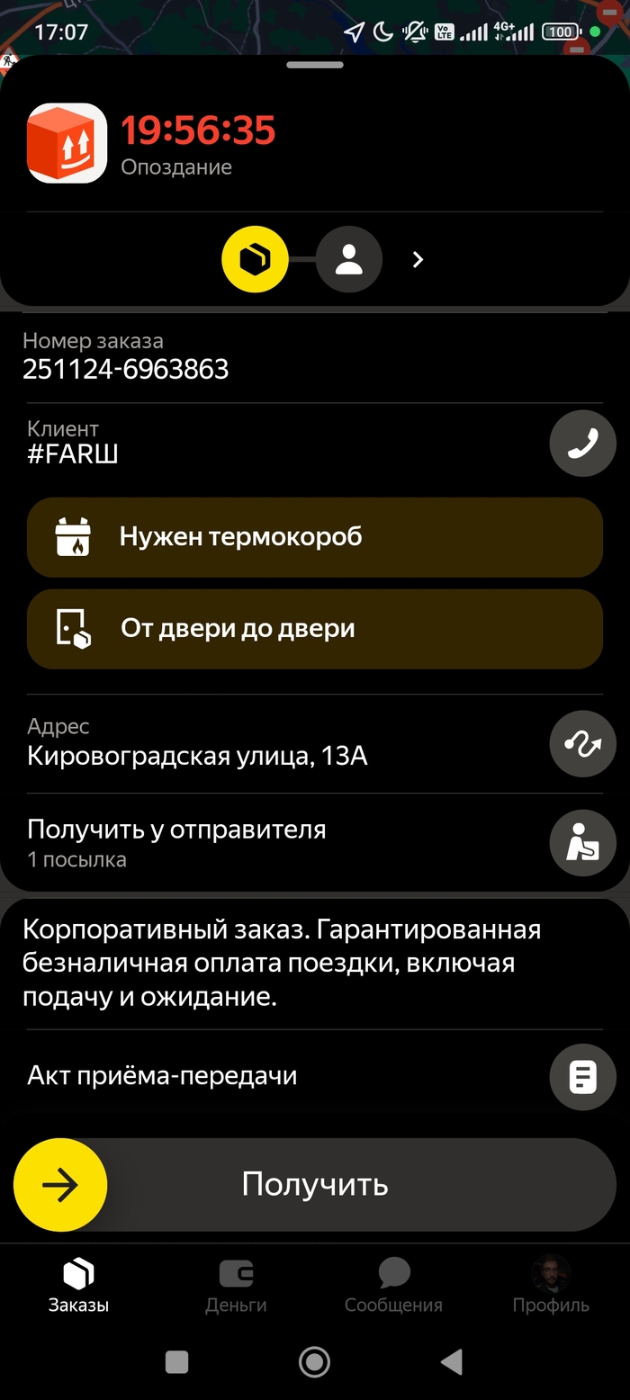 Пришел заказ из Фарша, ехал за ним около 15 мин в ТЦ Колумбус, встал на платную парковку и прибыл в заведение - все как положено. В Фарше сказали, что мой заказ уже отдали др курьеру, дополнив, что сначала был какой-то сбой, долго не искался заказ, а потом приехало несколько курьеров. Обычно это означает, что Я отменяю сам заказ через приложение и теряю баллы приоритета (такие особые очки, которые за выполненный заказ дают +1, за отказ от предложенного, ещё не принятого заказа -3, а за отмену принятого -7). Раньше можно было позвонить в поддержку и она отменяла заказ самостоятельно с компенсацией стоимости заказа. Сейчас в поддержку можно только написать, где бот пишет шаблонные сообщения до момента пока не дойдет до скрипта, где уже не может помочь самостоятельно. Тут вступает в дело человек и продолжает отвечать теми же шаблонами, но с фантазией - шаблоны видоизменяются. Так или иначе через письменную поддержку в таком случае невозможно добиться компенсации потраченного времени и бензина - только отменять самолично.