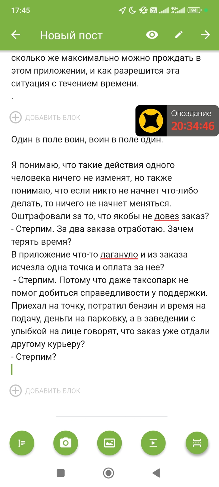 Я понимаю, что такие действия одного человека ничего не изменят, но также понимаю, что если никто не начнет что-либо делать, то ничего не начнет меняться. Оштрафовали за то, что якобы не довез заказ?