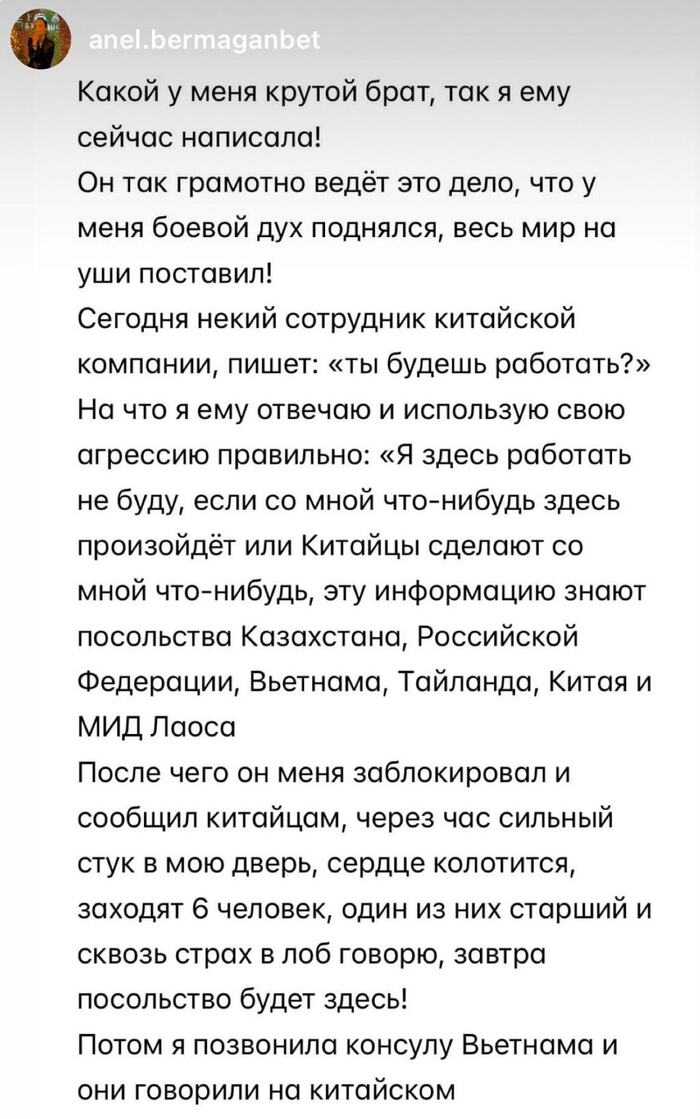 Таким фото Анель как бы подтверждает о переписке и отказе от работы в таких условиях и попутно она узнавала инфу у тех кто там работает (как я понял там работают ещё русскоговорящие выходцы из СНГ). И вроде как она первая, кто вынесла всё наружу, остальные языки в жопу засунули - обведено красным!