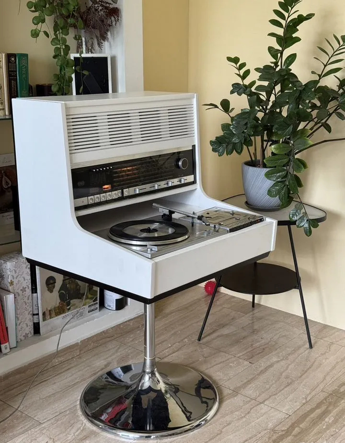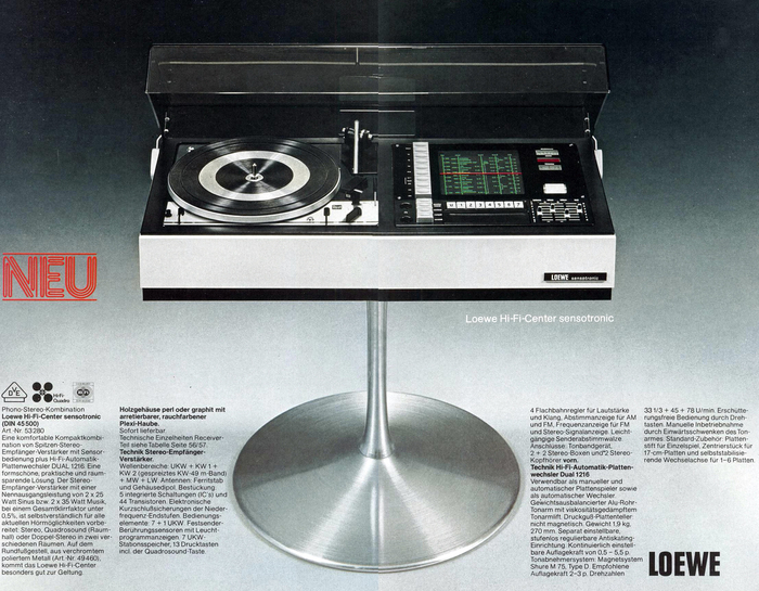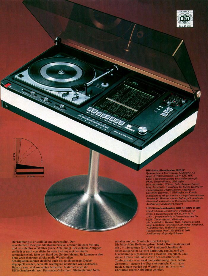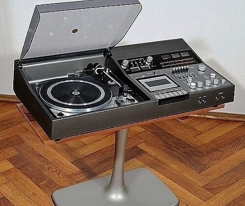 Расцвет эры музыкальных комбайнов пришелся на 70-ые годы. С одной стороны комбайны сильно «похудели» в объеме корпуса, а с другой стороны существенно улучшились качественные параметры. А как можно подчеркнуть красоту новой компоновки? Ни стол, ни тумбочка для этого не подходит- нужна специальная подставка.