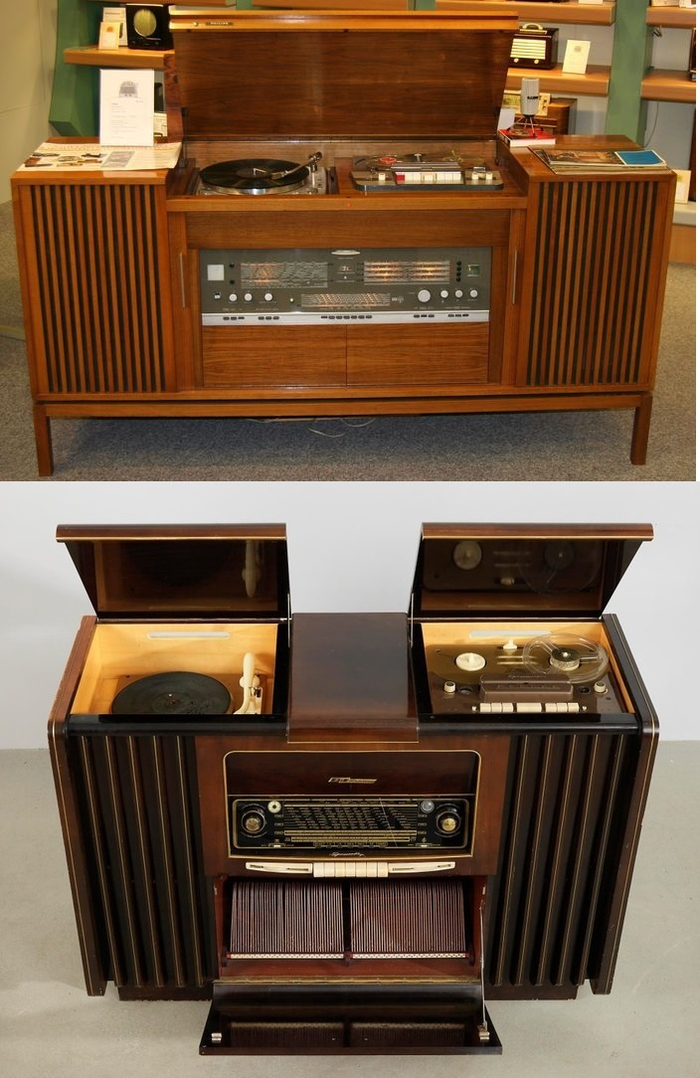 В конце 40х появились первые бытовые магнитофоны, которые тут же добавились в радиокомбайн. Еще и существенно возросло качество звукозаписи, а это потянуло за собой повышение качества усилителей и акустики. Радиокомбайн 50х уже представлял собой огромный шкаф.