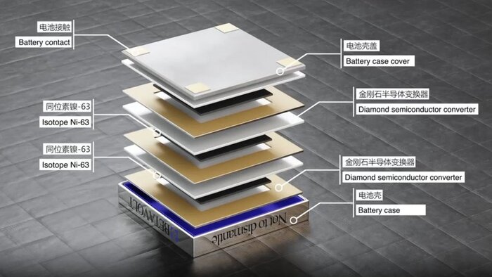 Напомним, что ядерная батарейка BV100 основана на радиоактивном изотопе никель-63. Он полностью безопасен, так как в процессе деградации не выделяет тепло (не взрывоопасен) и превращается в стабильную медь. Заявленный срок службы, без надобности обслуживания или подзарядки, составляет 50+ лет. Текущий вариант батарейки для массового изготовления обладает напряжением в 3 В при общей мощности 100 микроватт.