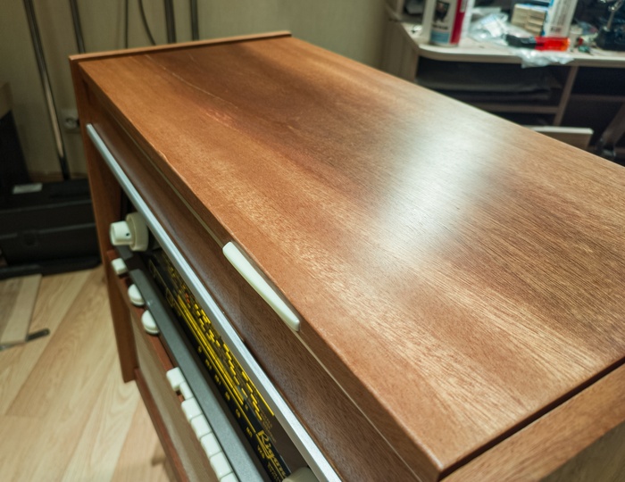 Изготовил почти полность новый корпус, самостоятельно покрыл его шпоном, затем маслом.