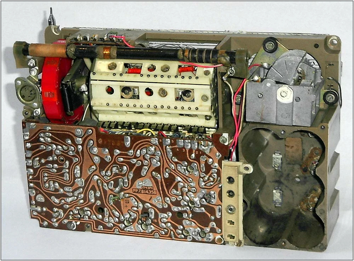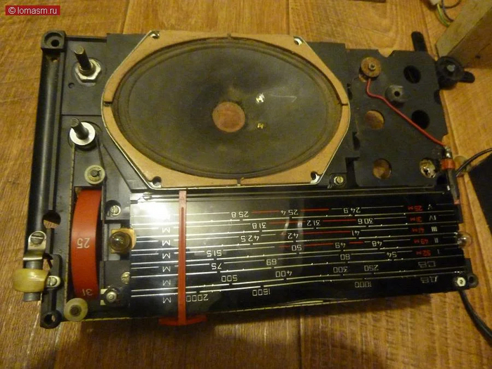 Для улучшения акустических характеристик ручки управления с боковой стенки перенесли на верхнюю панель. Раз ручки там, то и шкалу переместили на верхнюю панель. Вся боковая панель радиоприемника досталась динамику.