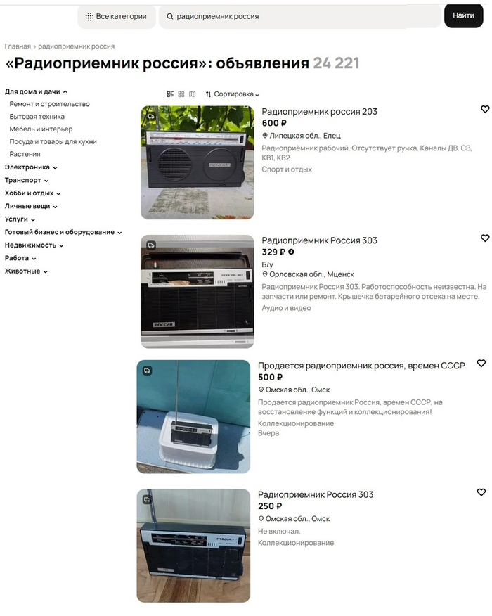 Небольшое отступление. Среди любителей старой радиоаппаратуры есть секта ортодоксальных ценителей старины. Для них любое вмешательство в конструкцию радиоприемника, изменение или доработка схемы- это сумма семи «смертных грехов», да еще и в квадрате. Вот специально для них я сейчас задал поиск на авито и смотрите результат. Радиоприемник «Россия» продают аж 24221 продавца! Покупайте и спасайте девственность раритетов, если уж так радеете.