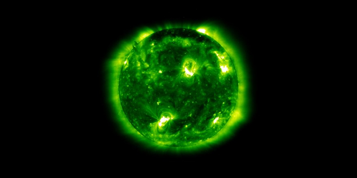 А теперь поищем зелёные звёзды, например, с температурой поверхности около 6 000 К. Их пик находится в сине-зелёной части спектра, так что Солнце должно быть зелёным. Но почему мы не видим этот зелёный цвет? Даже у наших глаз есть способность воспринимать его! Да и глядя на спектр, после жёлтого, идёт зелёный, и только потом голубой.