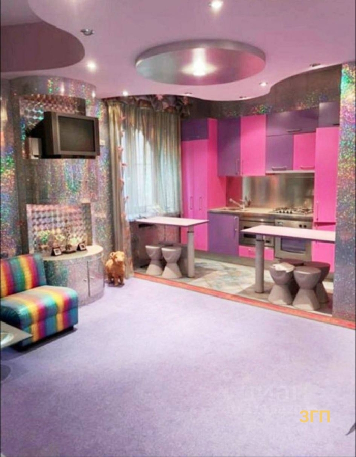 В Москве нашли квартиру, которая спасёт от депрессии. Диваны в ней радужные (прости, РКН), стены — с голографическим эффектом, а гарнитур сделан в фиолетовых и розовых цветах.