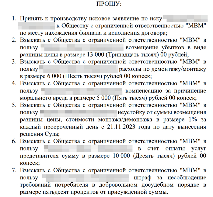 В досудебке я просил уже больше - 11 000 за разницу в цене, 6 000 за установку, 0,5% в день неустойку с 17.10.2023 (если бы выплатили 11.11.2023 - было бы 2 210 руб.) и вернуть списанные 2 000 бонусов, итого 19 210 руб.