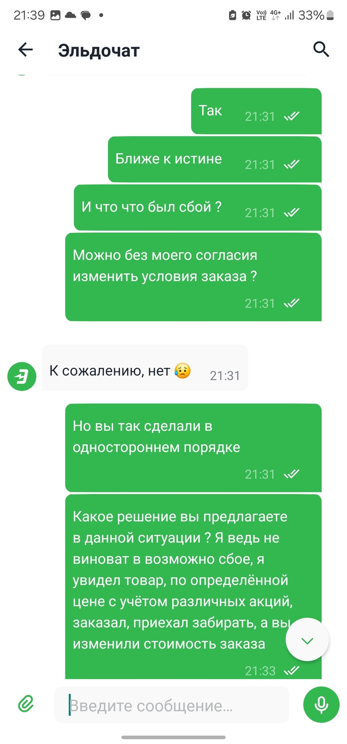 Я написал заявление, забрал ноутбук, вышел на улицу и решил в очередной раз позвонить в поддержку, где уже в третий раз всё как под копирку - невозможность возврата, упоминание дистанционных продаж, предложение обратиться в магазин - оказывается что в политике Эльдорадо решение принимает именно руководство магазина. Доехал до дома, решил списаться в телеграме со службы поддержки, надеясь попасть на более компетентного сотрудника. Четвёртое общение было похоже на три предыдущих - невозможность, дистанционные продажи, рекомендации обратиться в магазин.