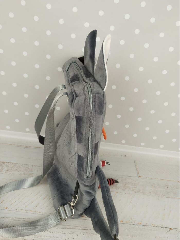 До этого у меня были волки тоже, но больше игрушки, чем рюкзаки. Был только один карман - рот. Туда особо ничего не входило, больше для красоты. Этот уже полноценный рюкзак, тоже для красоты, но еще и с функцией ношения предметов размером до А4 включительно. И рты у прошлых волков были просто замком с верхним рядом зубов. А этого решила сделать с яркой такой пастью, красной-красной, и с двойным рядом зубов.