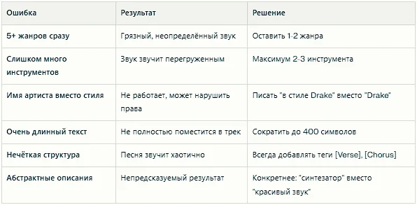 Важно: Suno не может имитировать конкретных артистов по имени (это запрещено), но может создать музыку "в стиле драматичного рока с мужским вокалом" или "в духе современного хип-хопа". Это защищает от проблем с авторскими правами, но при этом даёт огромную творческую свободу.