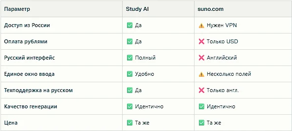 Если вы попытаетесь открыть официальный сайт suno.com из России, столкнётесь с несколькими проблемами: геоблокировка, сложность с оплатой карточками Visa/Mastercard, английский интерфейс и необходимость VPN. Именно для решения этих проблем создана платформа Study AI — официальный партнёр Suno, который предоставляет доступ к нейросети через удобный русскоязычный интерфейс.
