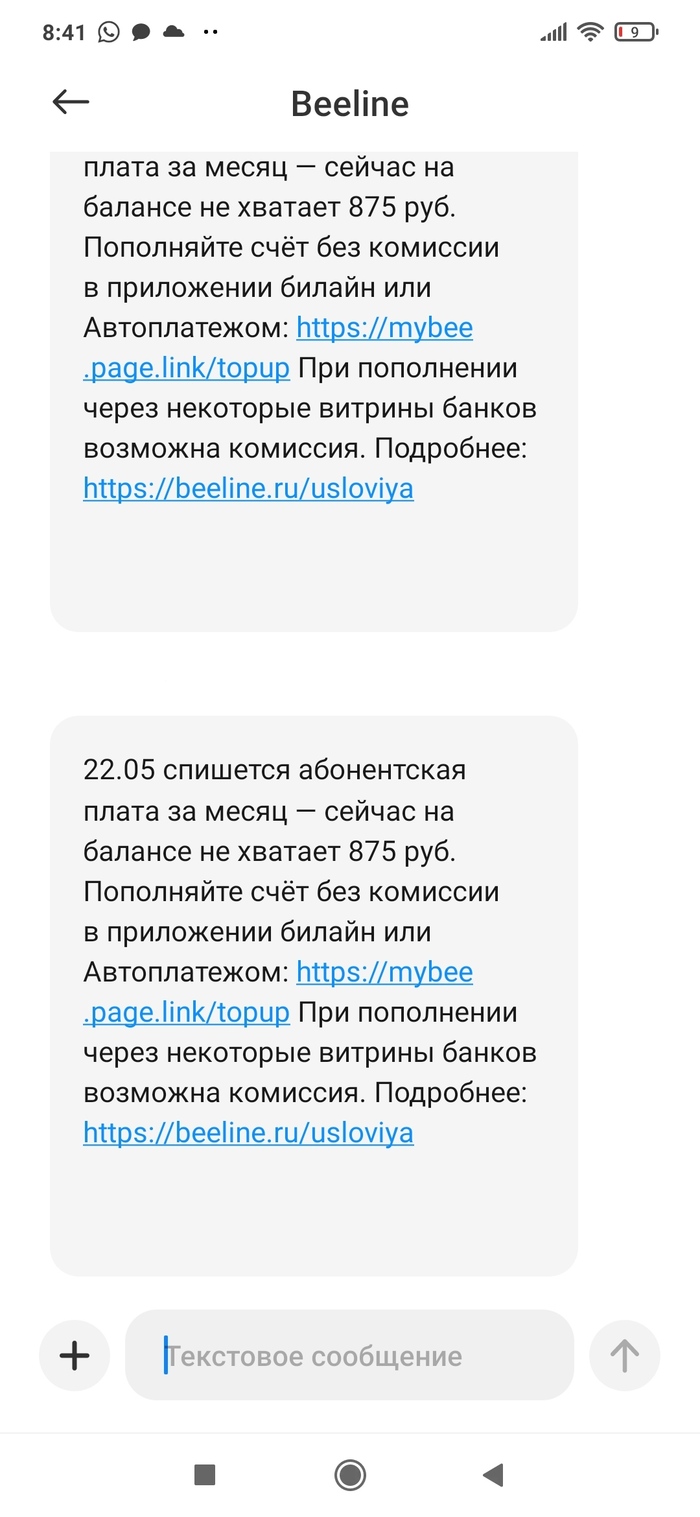 Приходит СМС от билайн.